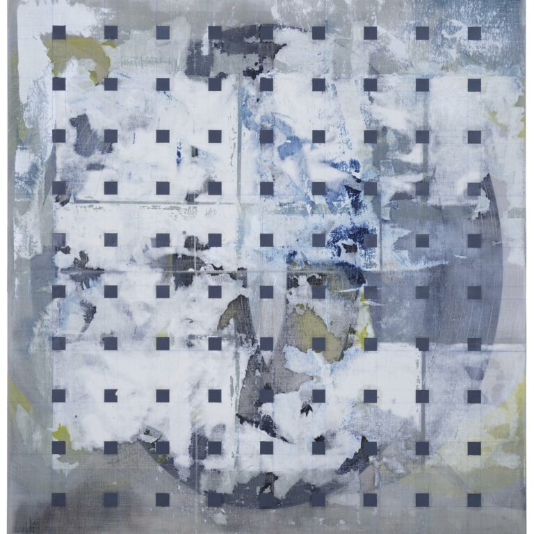 acrylic, enamel, spray paint, indian ink and paper on linen, framed
