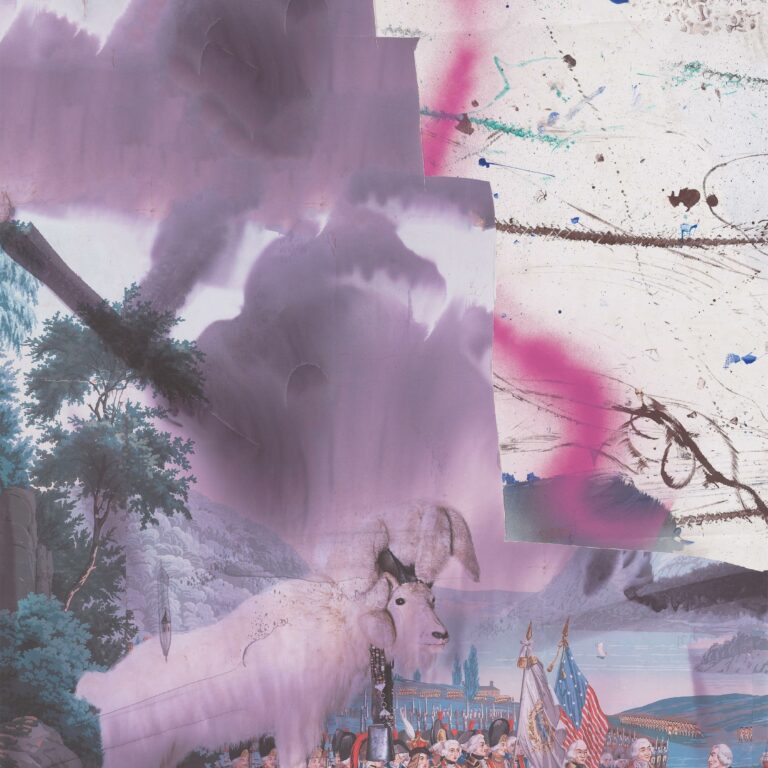 oil, spray paint, printed paper on collage, framed