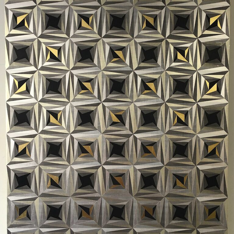 aluminum, Silver, 12k white gold leaf and 22k gold leaf with acrylic glazes on panel