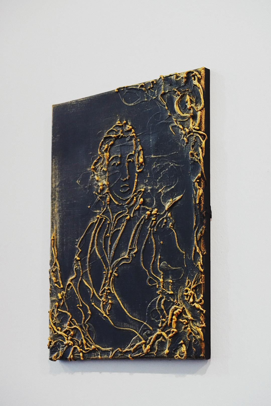 Gold lines stand out against a dark surface, catching the light and creating a strong visual contrast. The person in the picture is only suggested. We see the outline, not the details.
