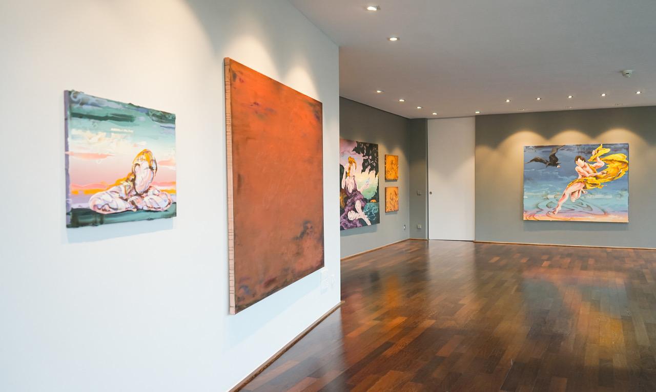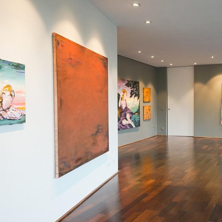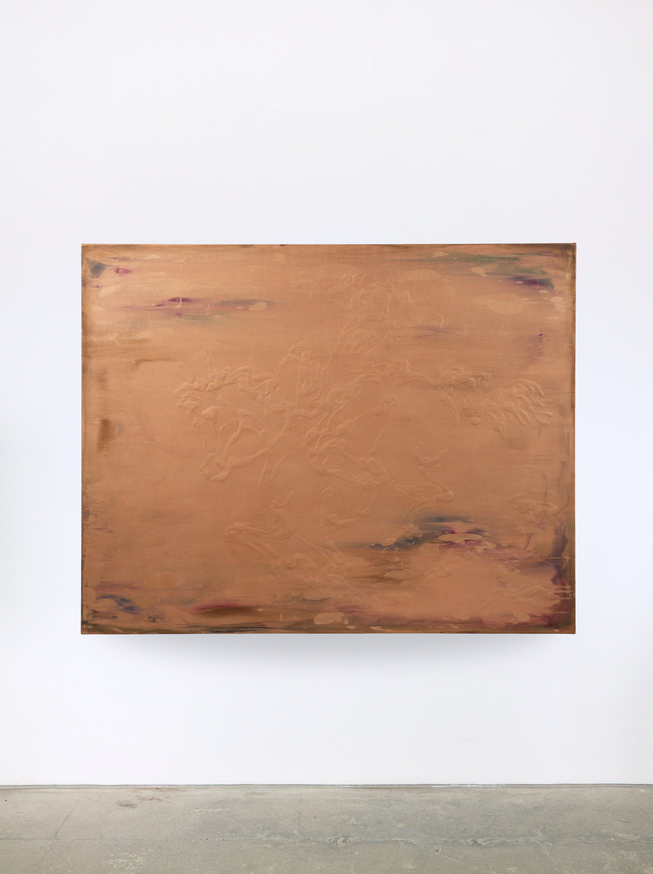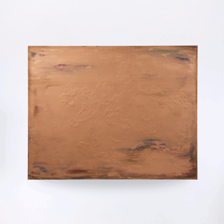 Presented in the exhibition Sagen der Trinkhalle in Baden-Baden, In the Flashlight Fremersburg (2022) by Lennart Grau envelops the viewer in a vast, copper-hued field, where textures beneath the paint conjure the exhilaration of a horse racing down a hill. The work captures the liberating sensation of letting go, merging with wind, motion and nature. It evokes the same transformative energy that has long surrounded the town’s legendary waters. Grau invites viewers to lose themselves in this elemental experience, where the boundaries between body, environment and myth dissolve in a moment of pure freedom.