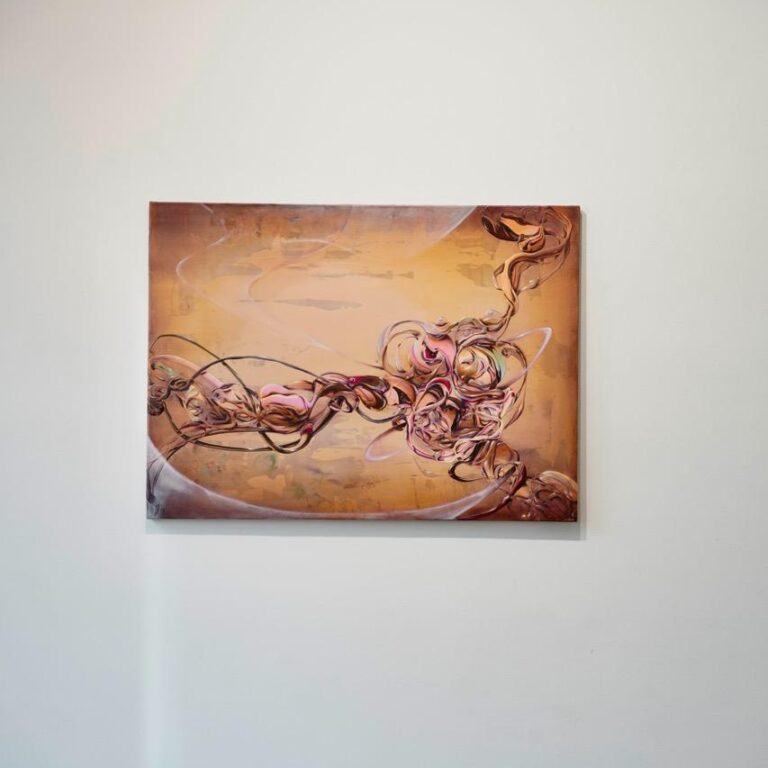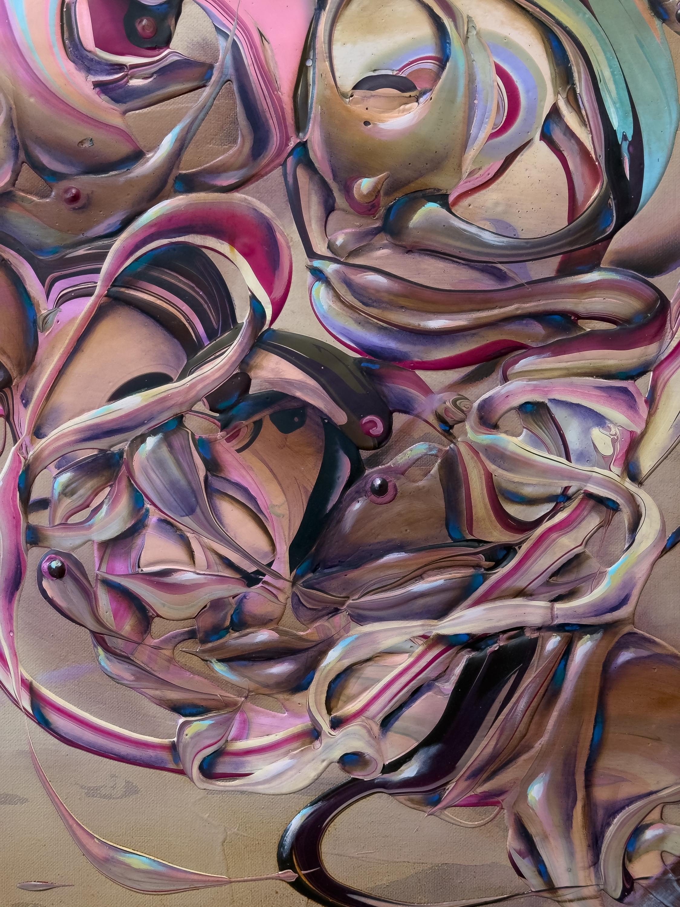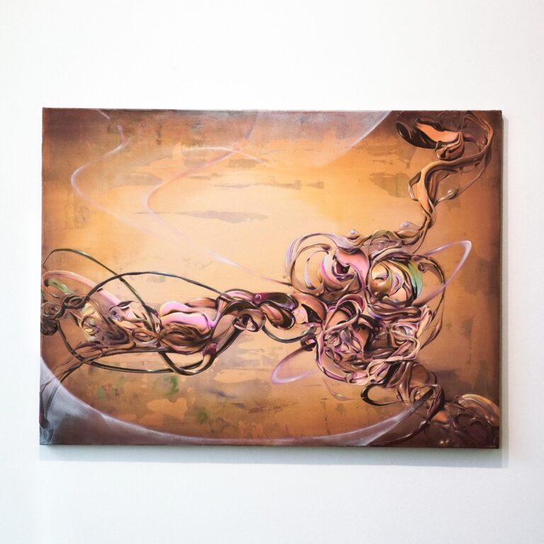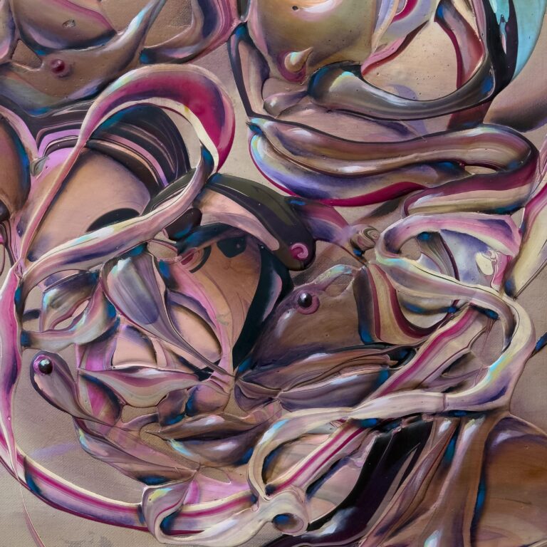 Lennart Grau works with oil and acrylic to build layered compositions that move between realism and abstraction. In “In Wallung / Nudes”, the brushwork and use of color create a sense of divine and almost celestial forms. Light, shadow and subtle trompe l’oeil effects give the work a striking presence while also allowing the shapes to feel as if they could shift or dissolve at any moment.