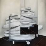 paper, cardboard, wood, sewing thread, pins, gouache, spray paint