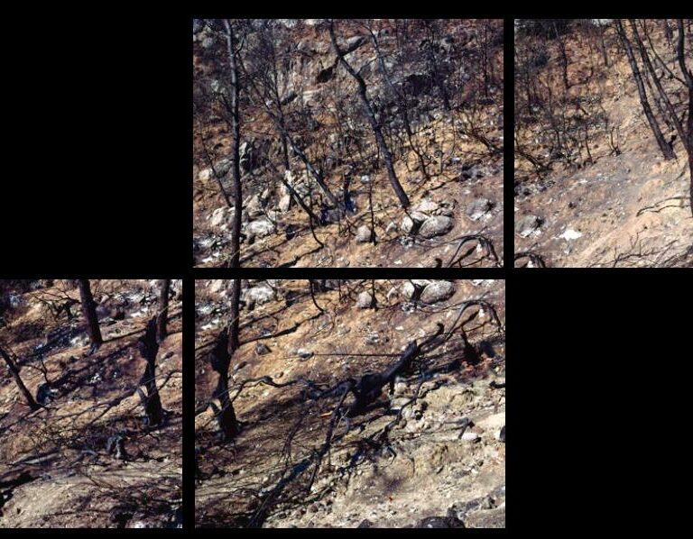 The polyptych Kaifa, Peloponnes is part of the series The Ionian Road, consisting of landscape photographs Andreas Gehrke has taken in Southern Peloponnes, Greece in 2007. “The fires began towards the end of August and by the time they had died down 67 people were dead, 260,000 hectares of forest and farmland had been consumed, destroying thousands of homes. One of the hardest hit areas was the Peloponnese in southern Greece, a region known for its olive groves, forests and unspoiled (and undeveloped) beaches. In the aftermath of the fire, as residents struggle to rebuild their lives and livelihoods, there are rumours of large companies taking advantage of the destruction to push through controversial development plans that will change the nature of the Peloponnese forever. Large, “Costa del Sol“-style developments are being pushed as a way to get the region back on its feet and a long-planned road scheme looks as if it will finally be built. The Ionian Road, which will give access to the region from the overpopulated Athens region, will be a six-lane motorway passing through areas previously given Natura status by the European Union, a classification aimed at limiting development in areas of environmental interest and sensitivity. With government aid still only trickling into the region the private sector is stepping into the breach, financing recovery efforts and promising to help residents whose homes, farms and villages have been destroyed. Some of these companies are the same ones who will profit from the Ionian Road: on July 24, just a month before the fires began, the Greek government signed an agreement worth € 2.8 billion with a consortium of Greek and European companies to build the road, that gives the consortium its toll revenues for the next 30 years.“