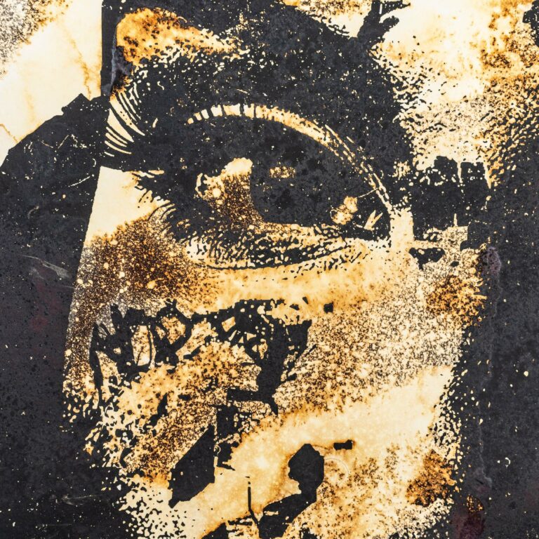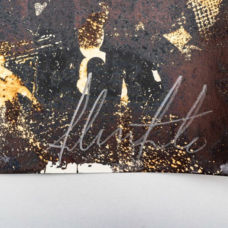 screen print on paper, screen print ink, quink ink, bleach and acid, hand-finished by the artist