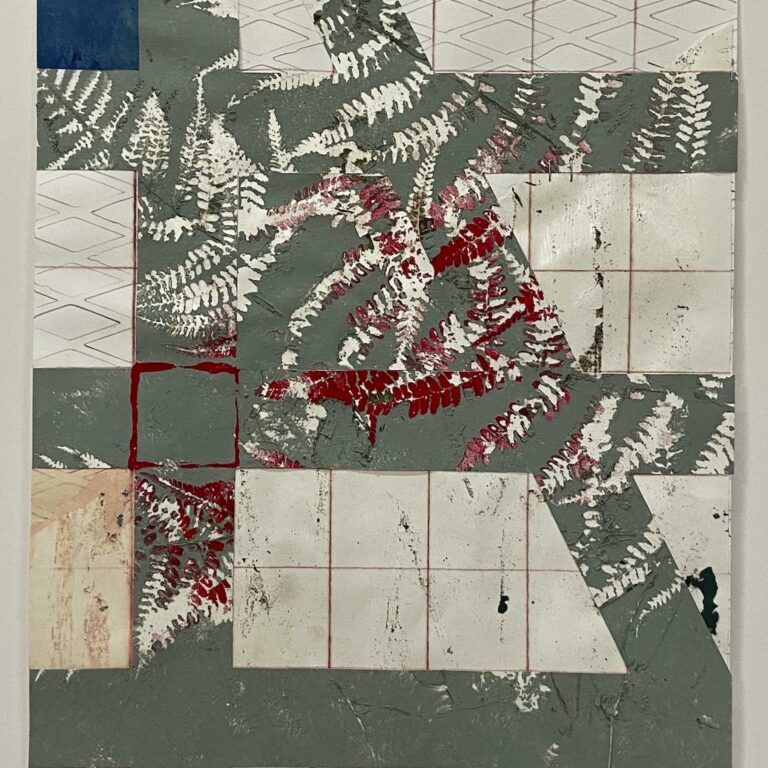 acrylic, oil and paper on linen, framed