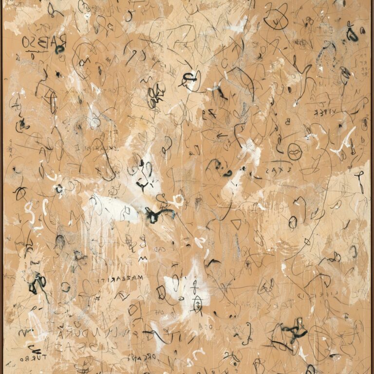 acrylic, charcoal, pencil, spray paint, felt tip and oil pastel on canvas, framed